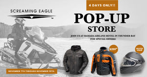 4 Days Only! Screaming Eagle Pop-Up Store in Thunder Bay Join us at the Ramada Airlane Hotel in Thunder Bay from November 7th to November 10th for exclusive deals on snowmobile and motorcycle gear! Jackets starting at $299.99Heated visor helmets, gloves, boots, and more!Don't miss out on this limited-time opportunity to gear up for the season!